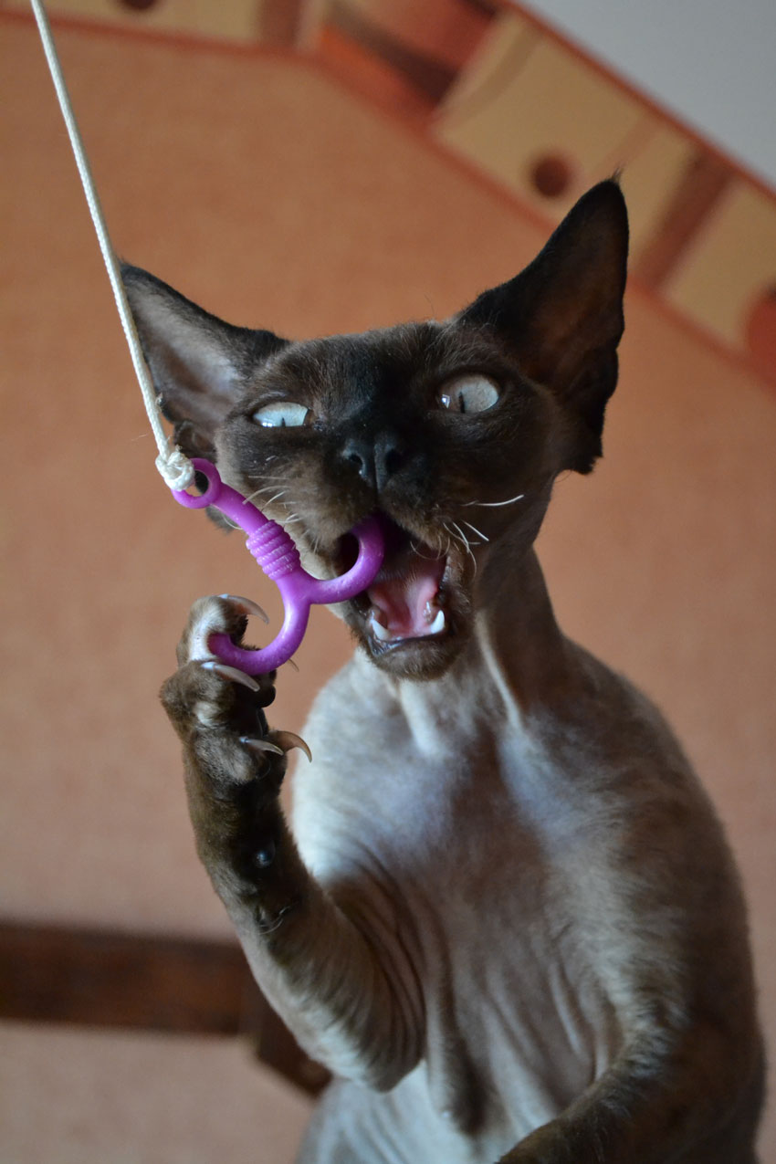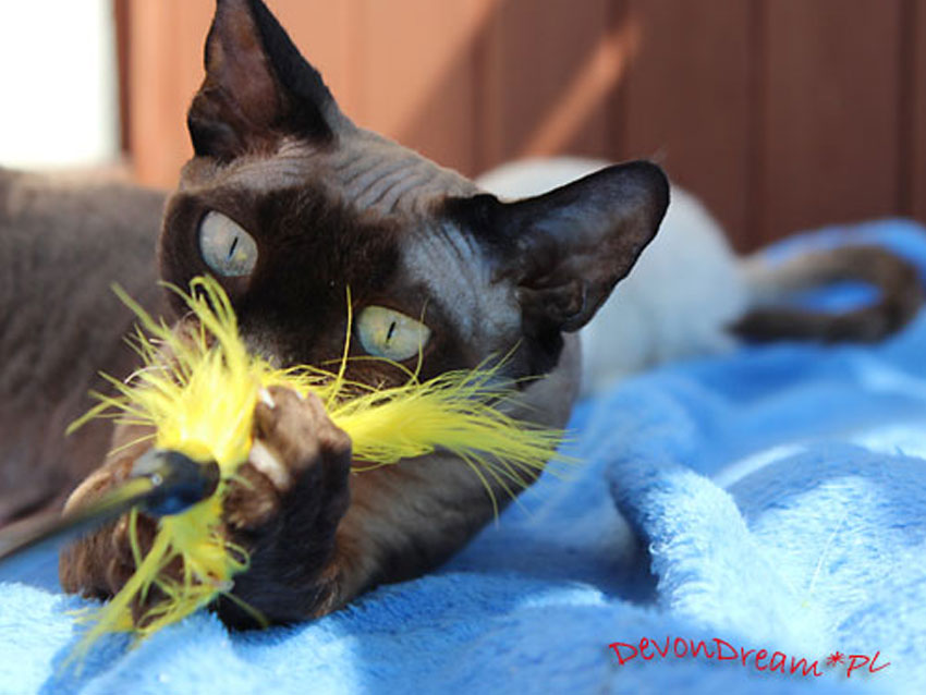 Uwielbia się bawić, szczególnie zabawką patykiem z piórkiem.